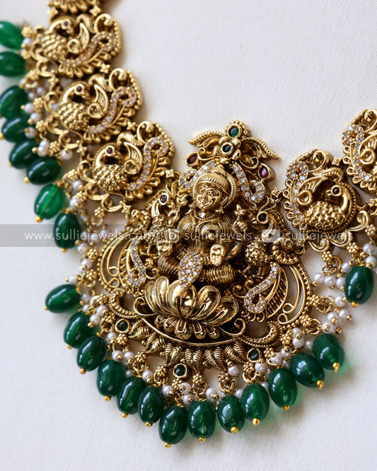 Premium Lakshmi Necklace with Jhumka ( Green Beads )