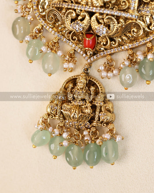 Coral Stone Premium Lakshmi AD Necklace with Earring - Green Beads