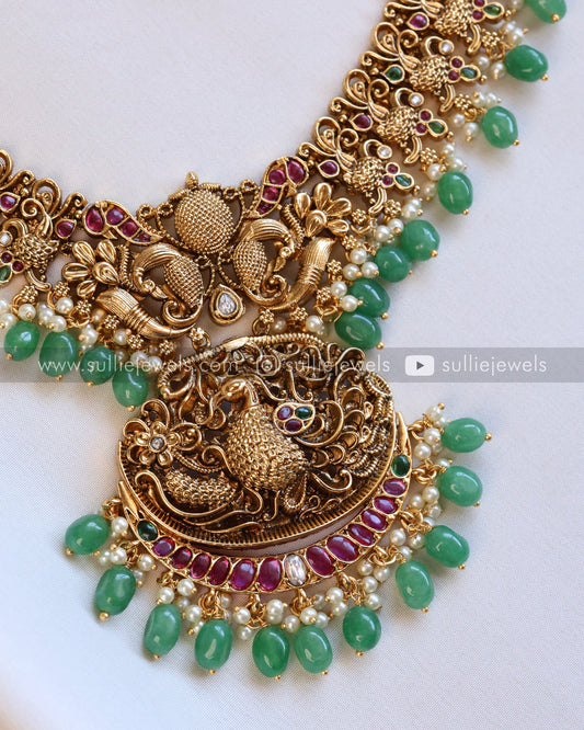 No Idol Premium Peacock Antique Necklace with Jhumka - Mint Beads