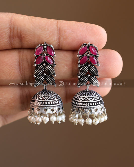 Pink Stone Leaf Design Oxidised Necklace with Jhumka