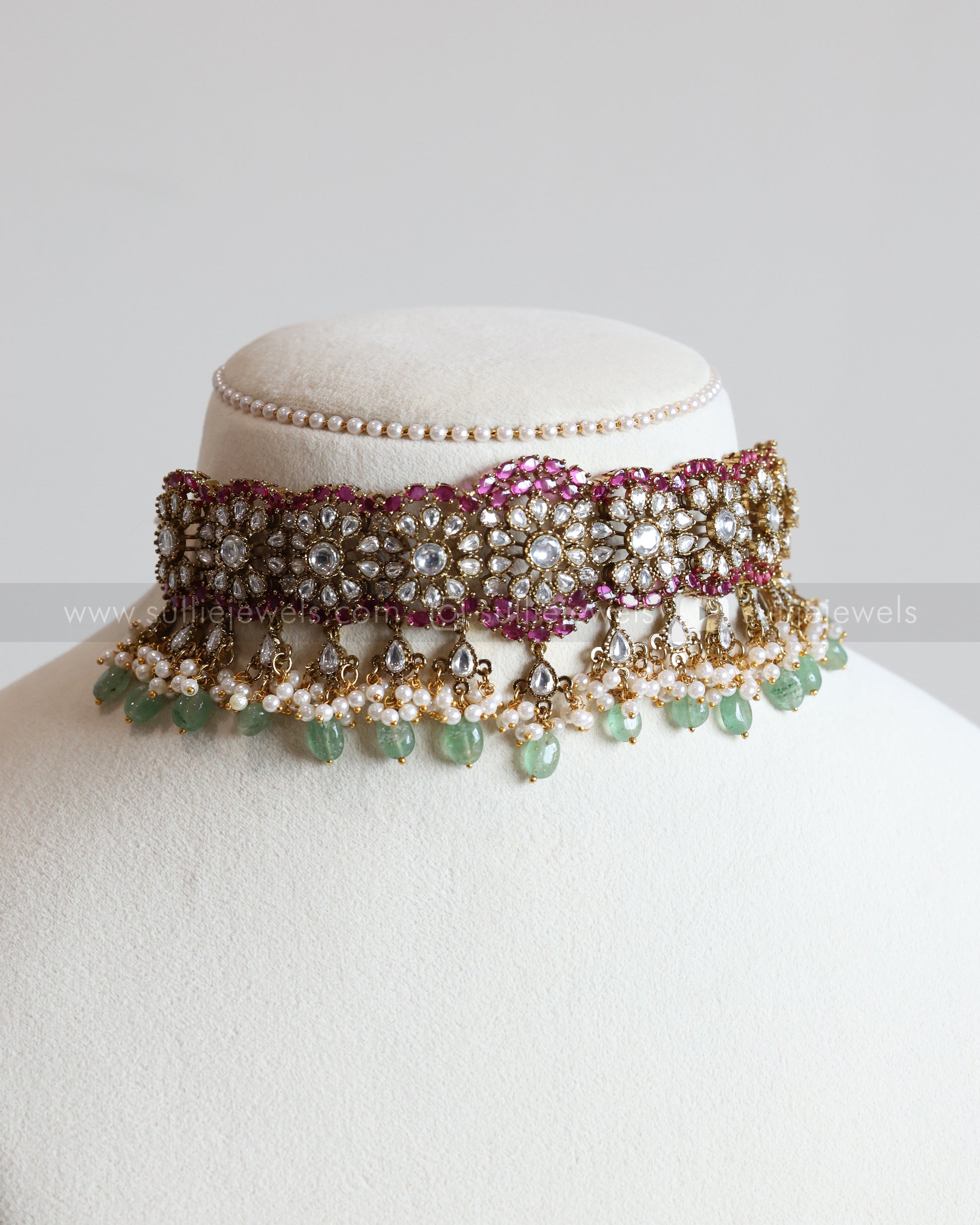 2097 - Designer Emerald & Ruby Floral Steady Choker with Stud