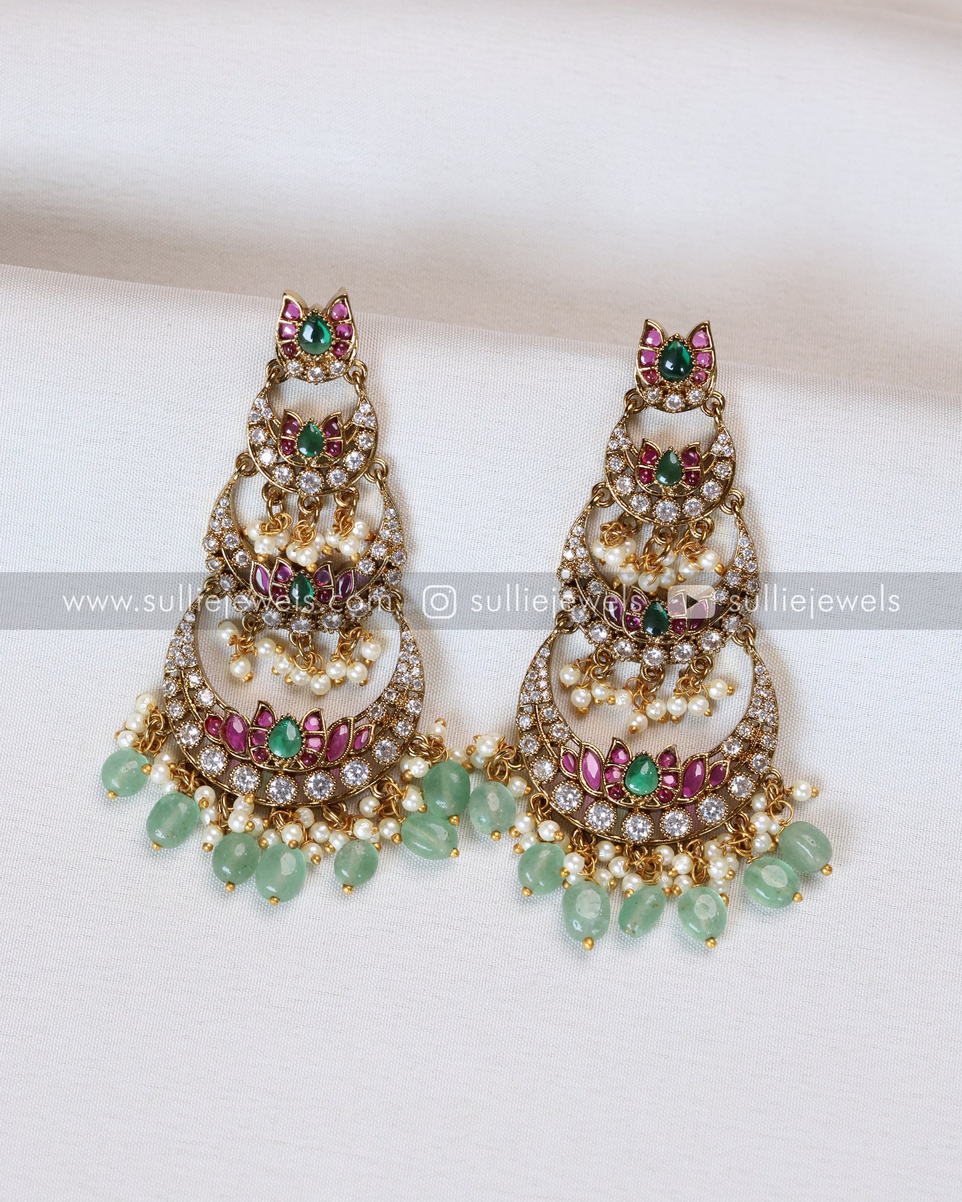 3 layer Kemp Chandbali Premium Earrings with Mint Beads