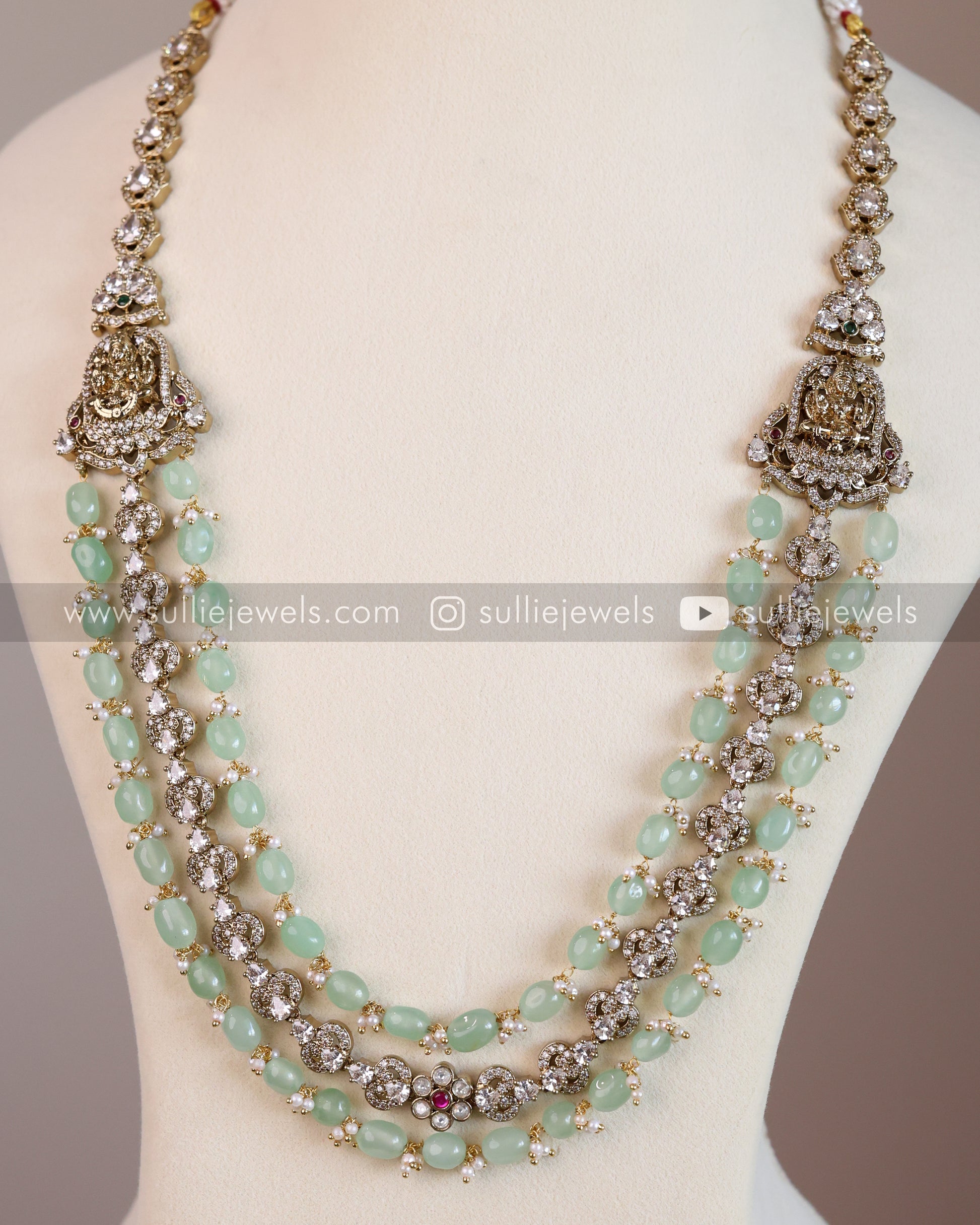 Moissanite & Mint Beaded Lakshmi Premium Victorian 3 Layer Long Chain / Haram with Earring
