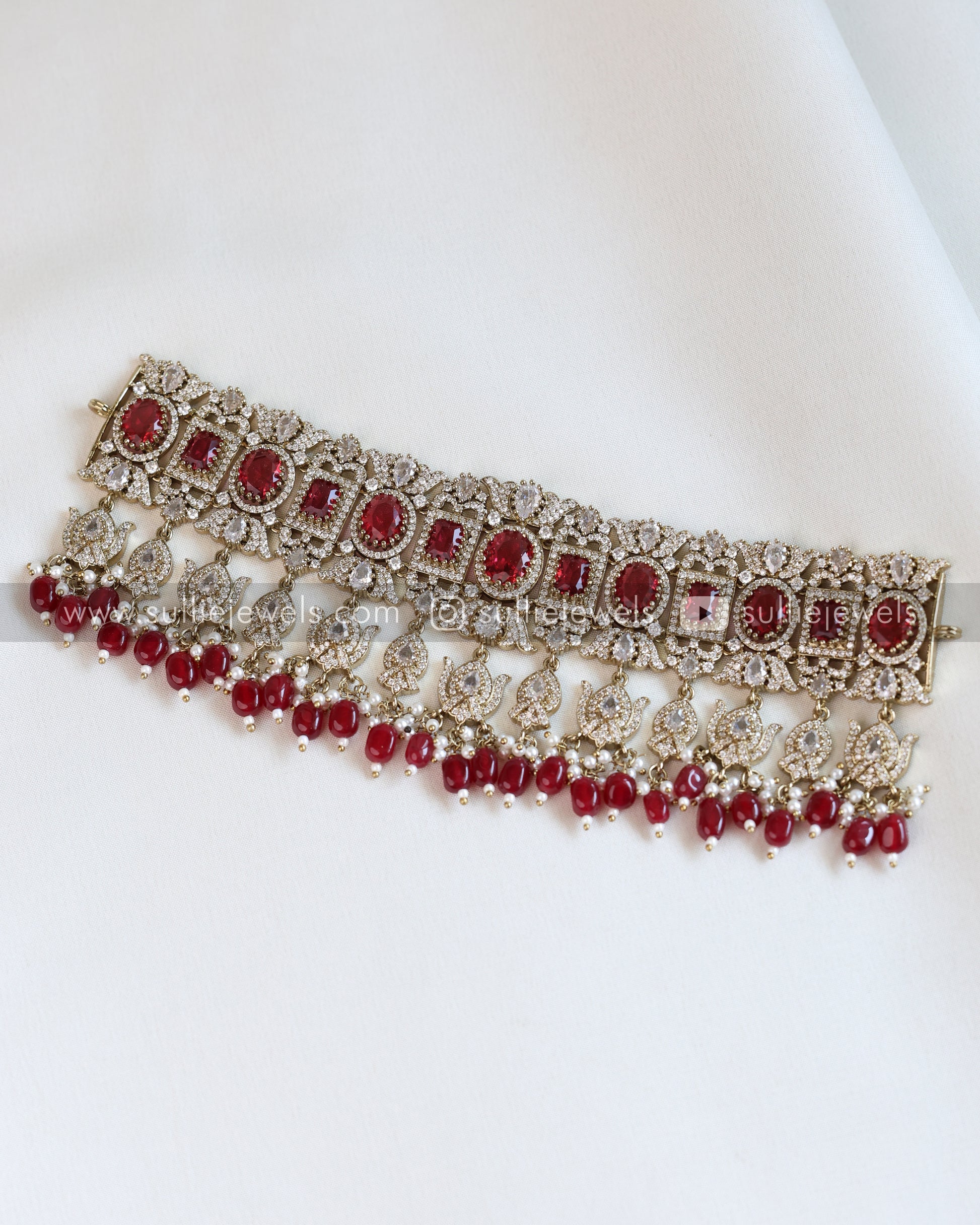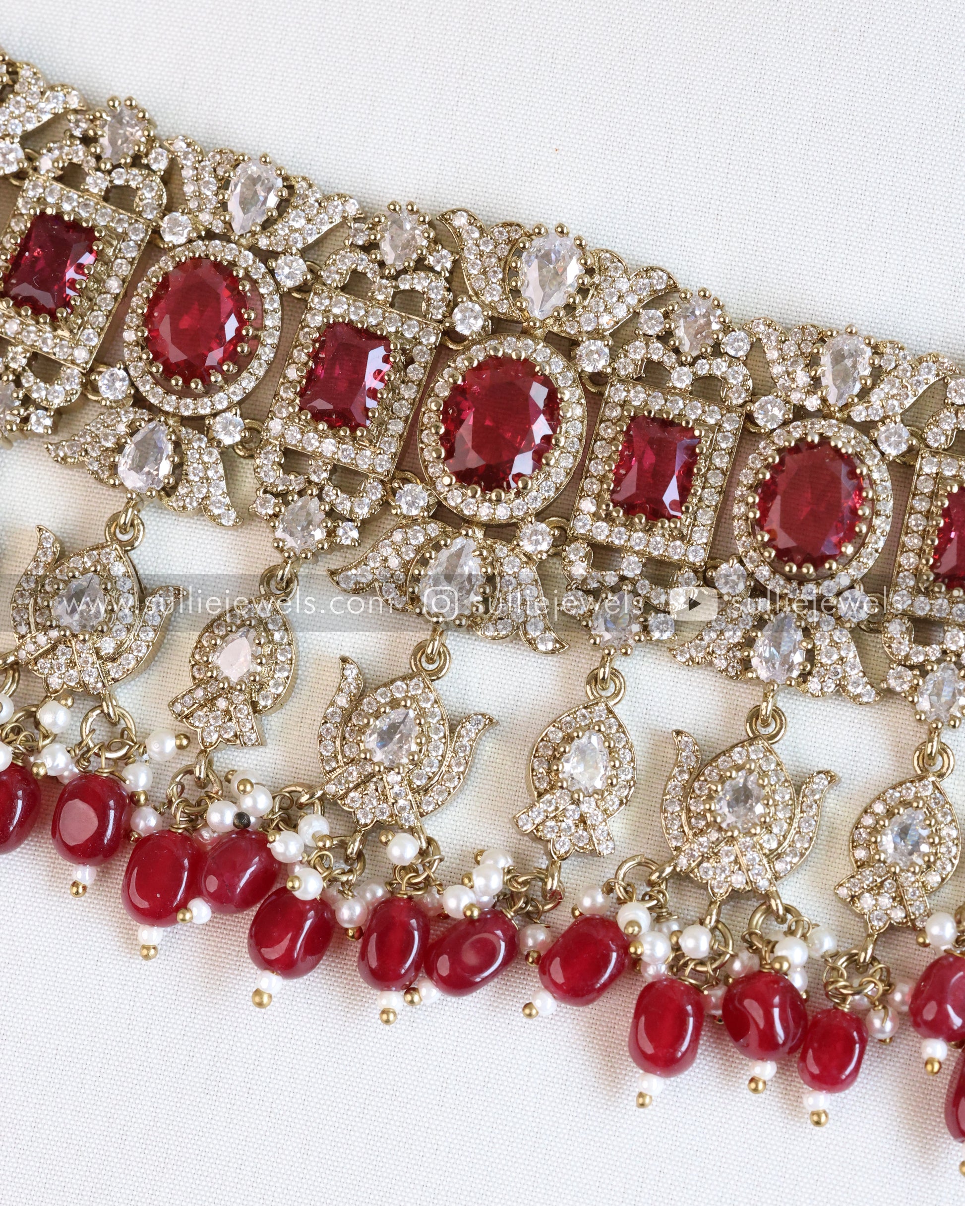 Polki Premium Heavy Choker with Earrings - Wine Red