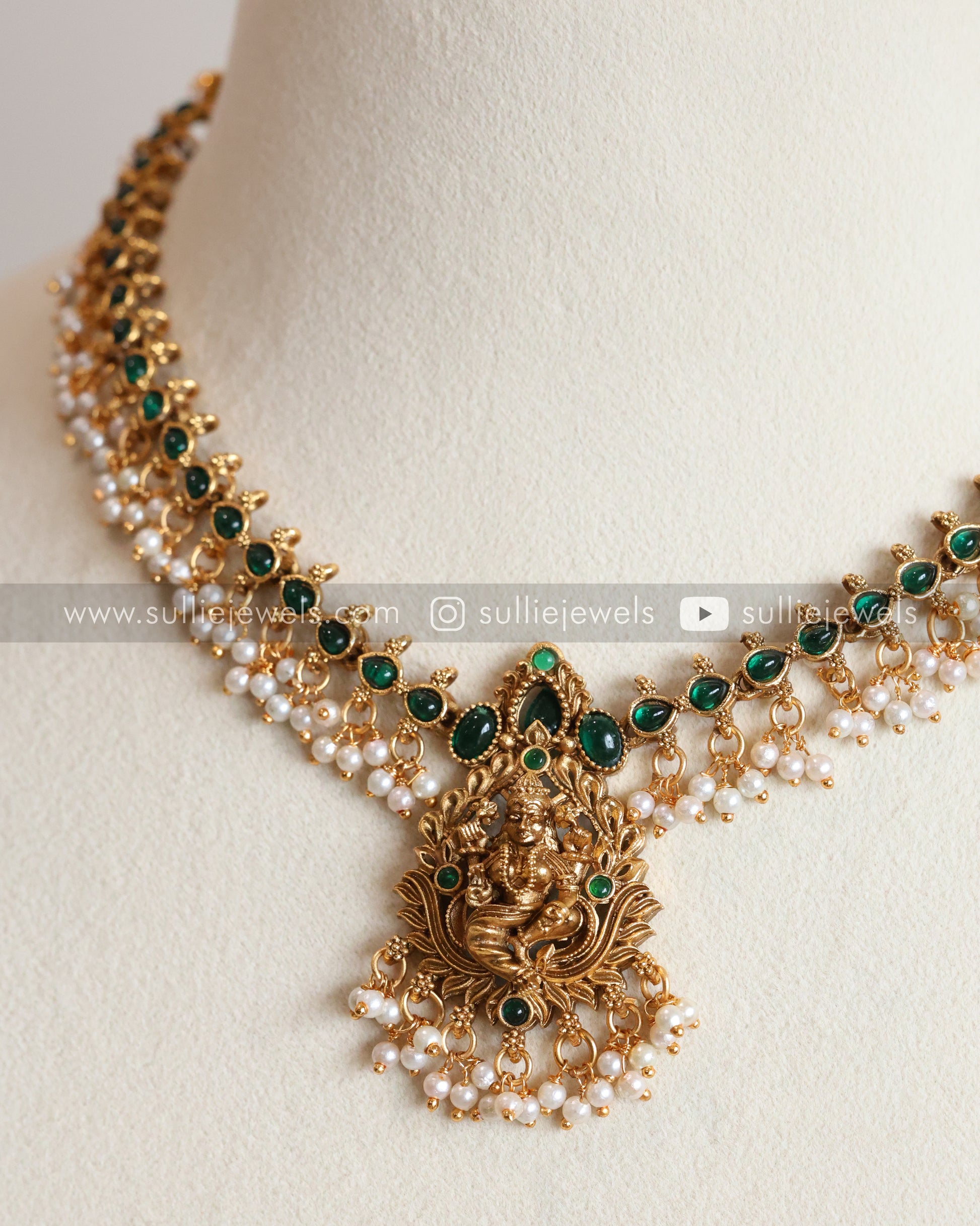 Sullie Basic - Lakshmi Pendant Green Stone Guttapusalu Necklace with Jhumka